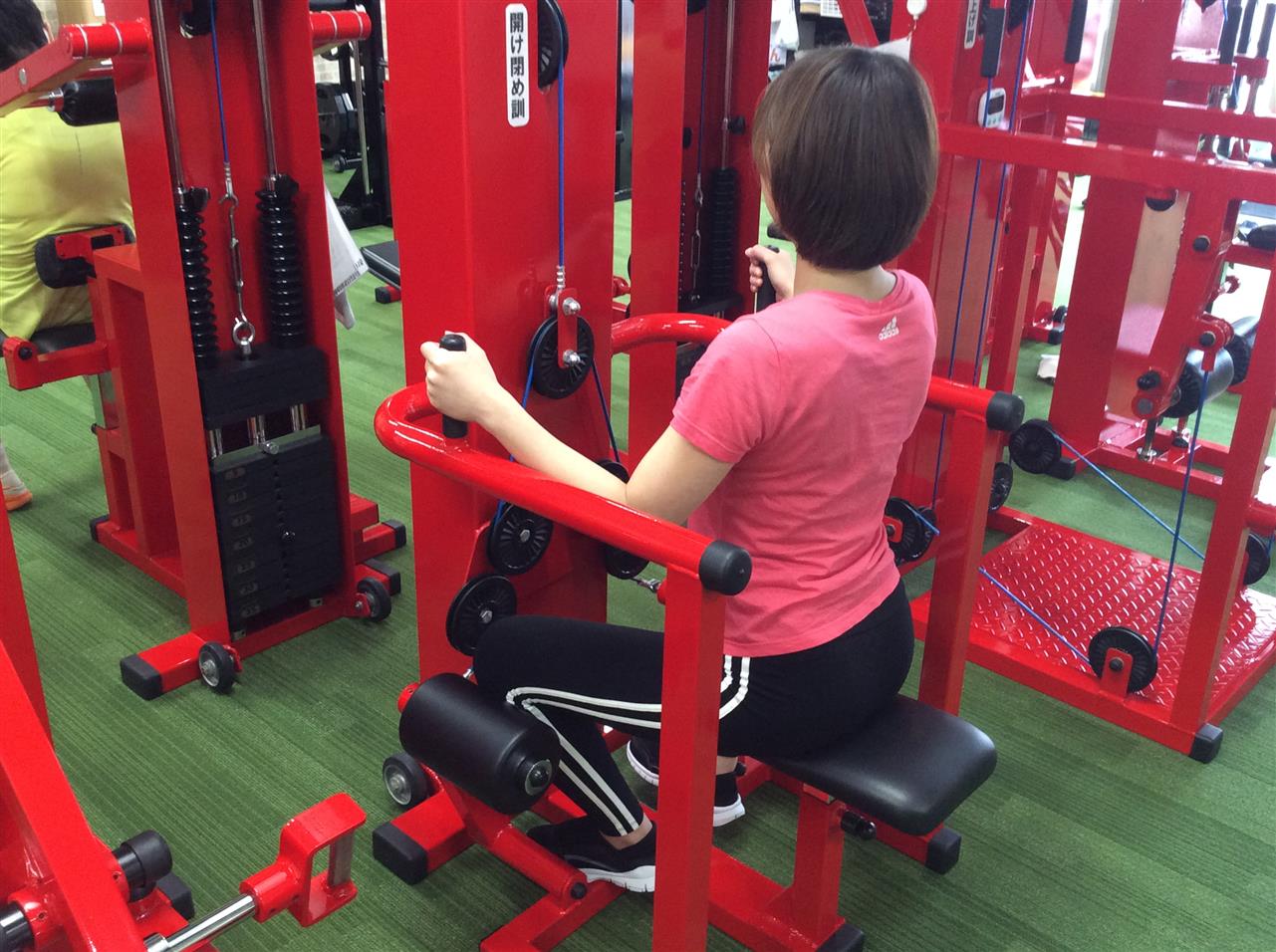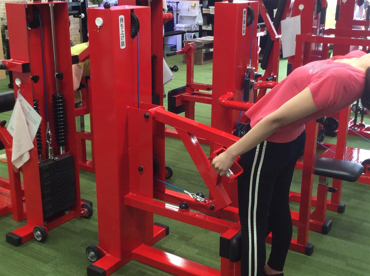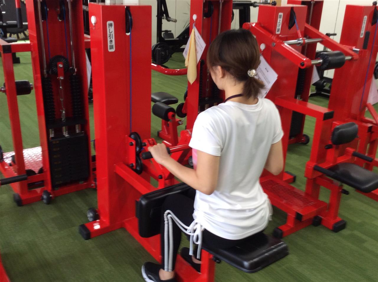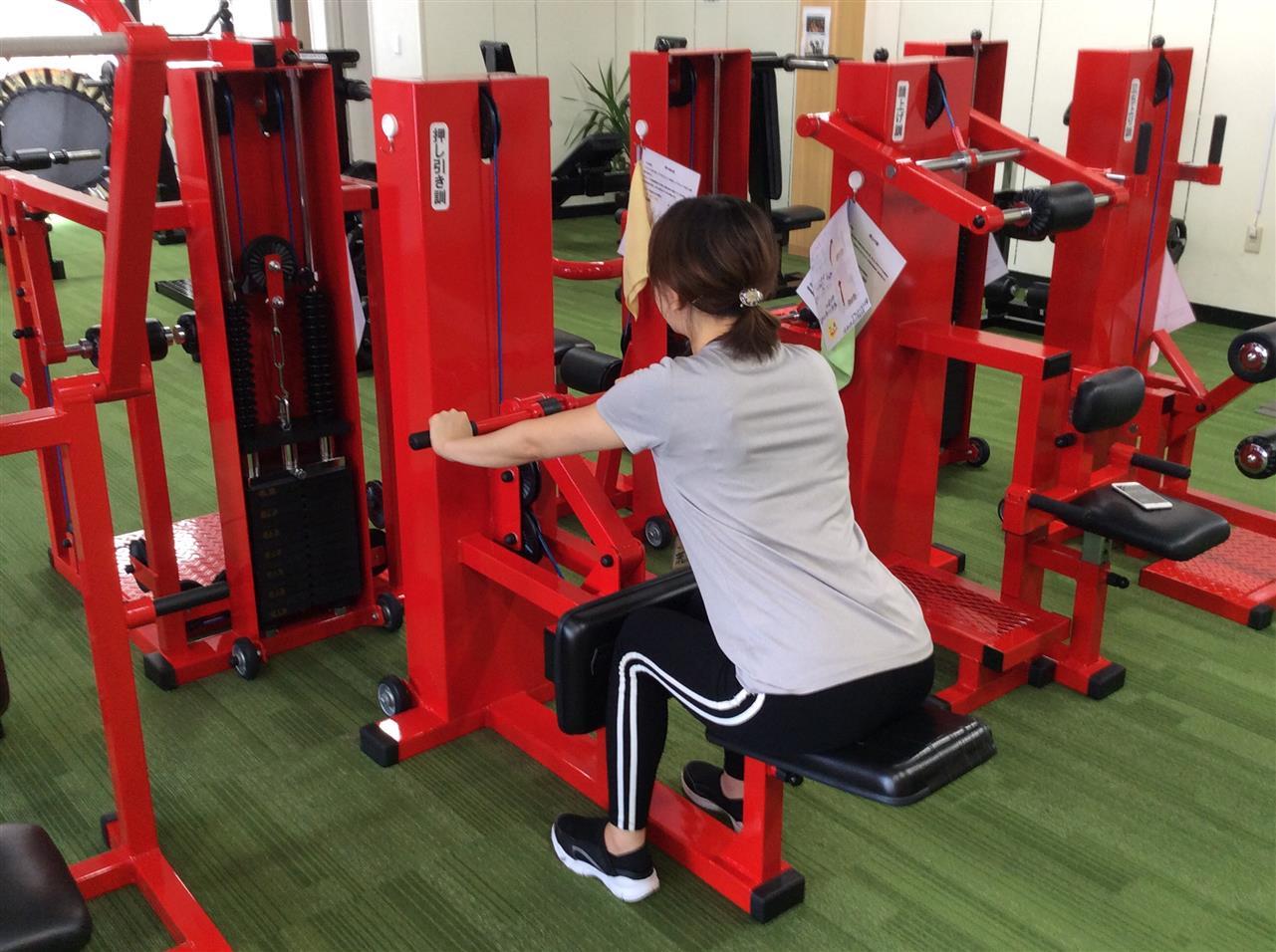 押し引き訓①✨このマシンでは「押す」と「引く」のふたつのトレーニンが可能です。「押す」では立ち上がりや起き上がりの際に必要な筋力を矯正し、これらの動作が楽に行えるようになります😃